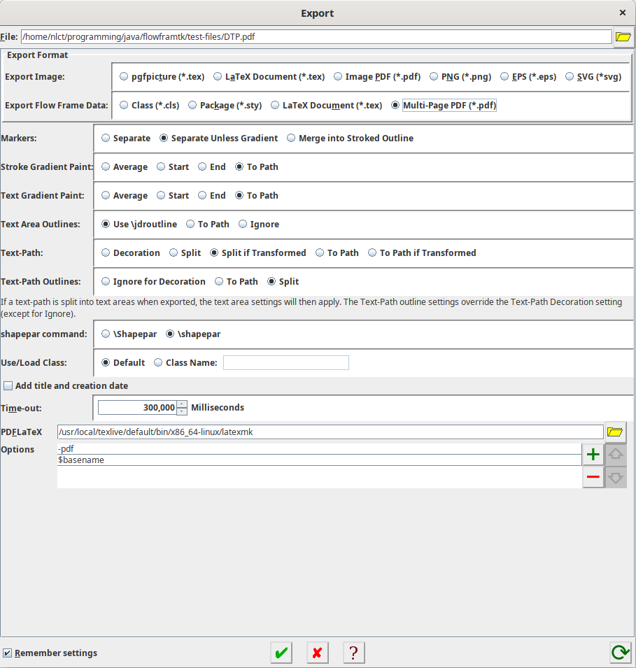 There are also two export to PDF functions, which use the applicable export to complete LaTeX document to create a .tex file in a temporary directory and then pdflatex is automatically run. The PDF is then moved to your chosen location and the temporary directory and its contents are removed. You can replace pdflatex with another application, such as latexmk or arara. In the latter case, you will need to add the special arara comment directives, which can be done in the “Magic Comments” panel. This means that the entire content of a document as well as the frame definitions can be bundled up in the jdr file. (I don’t recommend this for a large document as the code editor provided with FlowframTk is fairly basic and doesn’t include a spell-checker.) You will, obviously, need to have a TeX distribution installed.