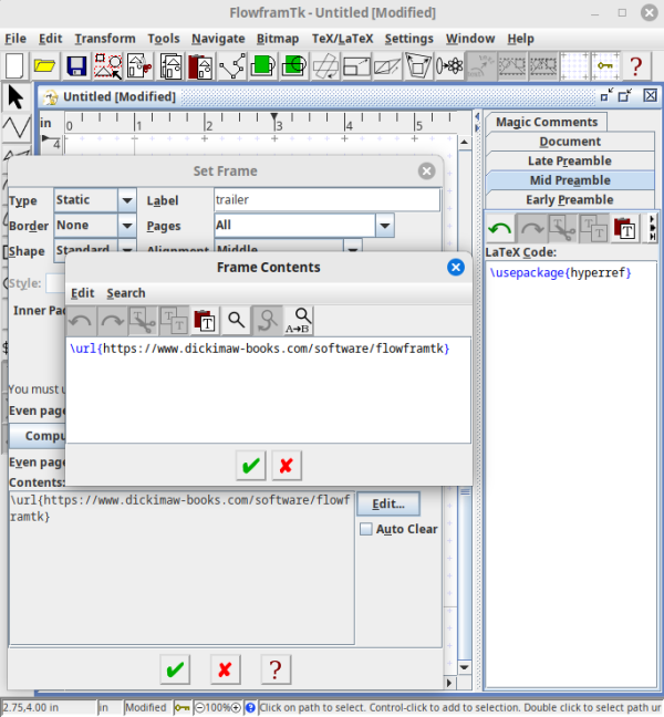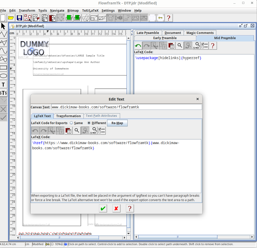 The single column with the title in the DrawFile is imported into FlowframTk as a rectangle with flowframe data assigned with the type set to dynamic and the content set to the code obtain from parsing the column text. The two-column area is imported as two rectangles both with flowframe data assigned with the type set to flow. Their content is put into the document code tab, but the markup and the character coding has to be converted. If any Draw text areas are detected, all other objects imported from the image will be set as static frames with the border set. In this example, that means the vertical line between the two columns, the extracted JPEG, and the text line with the URL. I can edit the text to use \href or \url in the alternative LaTeX text. (The Edit Text dialog has changed since the early days of JpgfDraw. There’s now more room for the LaTeX alternative code.) Remember to add hyperref to the mid or late preamble code.