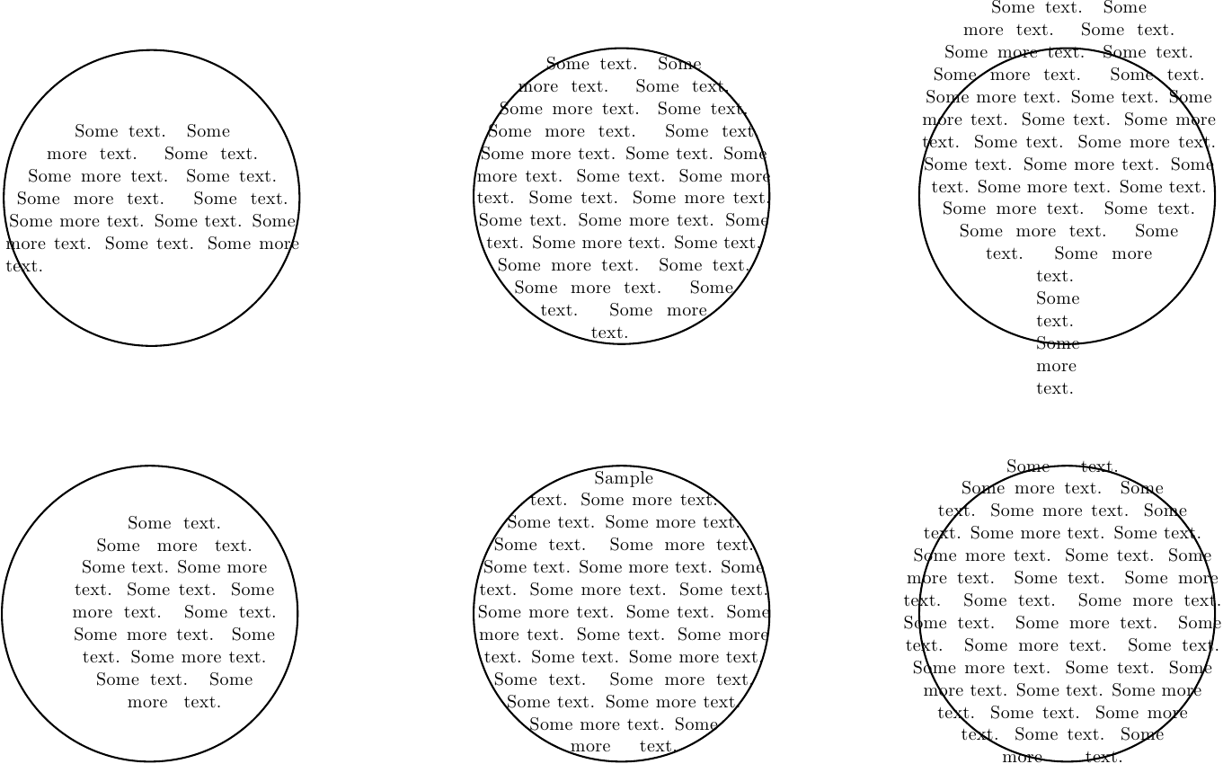 This layout was exported as a LaTeX package based on the flowfram package, and was included into a document. Each of the static frames were filled with a varying amount of text. The leftmost circles do not have enough text to fill the designated area, while the rightmost circles have too much text. (See Figure 10.10.)